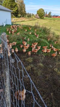 Våra höns lever fritt på stora ytor och har fri tillgång på foder och snäckskal. De har ett sandbad inne och värper i reden fulla med strö. Förutom att picka i sig naturlig föda ute får de även gräs inne varje dag under sommarhalvåret. Under vintern får de strö att sysselsätta sig med.